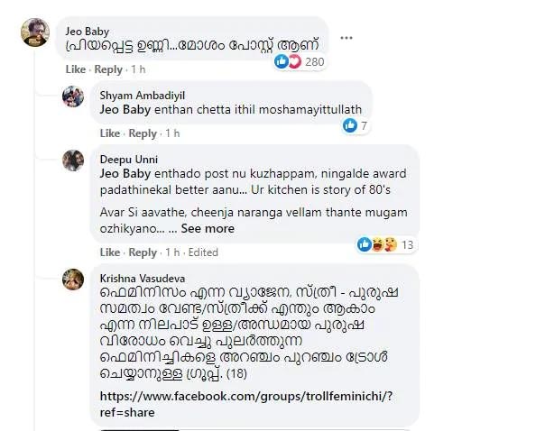 വലിയ പൊട്ടിലൂടെയല്ല, വലിയ സ്വപ്നങ്ങളിലൂടെയാണ് സ്ത്രീശാക്തീകരണം സാധ്യമാകുന്നത് എന്നായിരുന്നു ഉണ്ണി മുകുന്ദൻ ചിത്രം പങ്കിട്ട് കുറിച്ചത്. ‘പ്രിയപ്പെട്ട ഉണ്ണി, മോശം പോസ്റ്റാണ്’- എന്ന് ജിയോ ബേബി കുറിച്ചു. ഉണ്ണിമുകുന്ദന്റെ പോസ്റ്റ് ഡബ്യൂസിസി അടക്കമുള്ള സംഘടനകളെ ഉദ്ദേശിച്ചുകൊണ്ടുള്ളതാണെന്ന തരത്തിൽ വ്യാഖ്യാനം ഉയരുകയാണ് ഇപ്പോൾ.