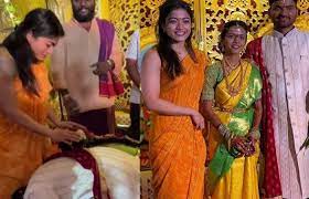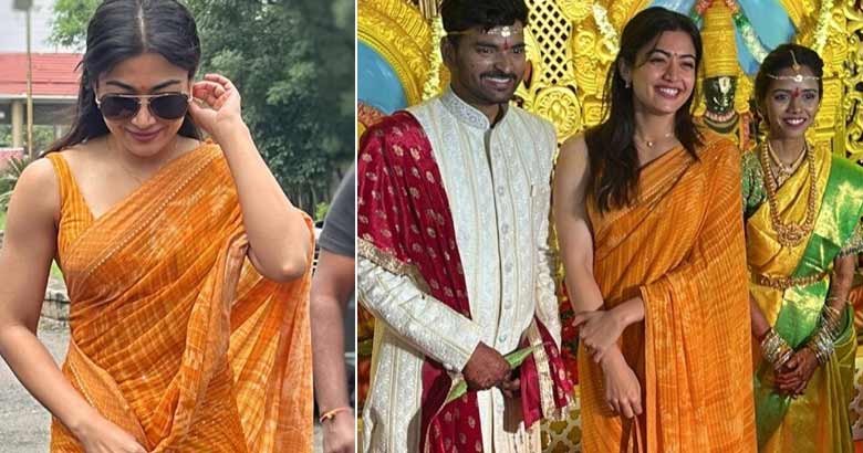 ഓറഞ്ച് സാരിയണിഞ്ഞ് അതിസുന്ദരിയായി ആണ് രശ്മിക ചടങ്ങിനെത്തിയത്. താലികെട്ട് ചടങ്ങിന് ശേഷം വേദിയിലേക്ക് എത്തിയ രശ്മിക നവദമ്പതികളെ ആശംസകൾ അറിയിക്കുന്നതിനിടെയാണ് വധൂവരൻമാർ രശ്മികയുടെ കാലിൽതൊട്ട് അനുഗ്രഹം വാങ്ങിയത്.