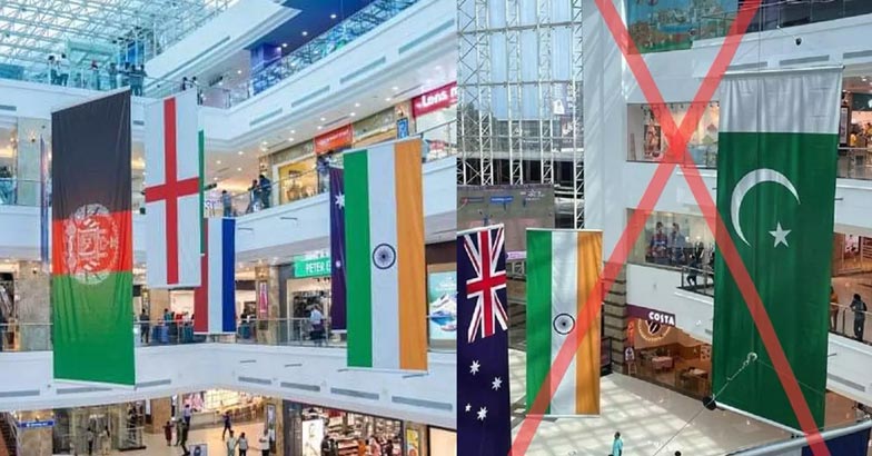 ഏകദിന ലോകകപ്പ് പ്രമാണിച്ച് ടൂര്ണമെന്റില് പങ്കെടുക്കുന്ന വിവിധ ടീമുകളുടെ കൊടികള് മാളില് പ്രദര്ശിപ്പിച്ചിട്ടുണ്ട്. വിവിധ ഉയരത്തില് വെച്ചതിനാല് ചിലത് വലുതും ചെറുതുമായാണ് ചിത്രങ്ങളില് കാണുന്നത്. എന്നാല് യഥാര്ത്ഥത്തില് അവയെല്ലാം ഒരേ വലുപ്പമുള്ളവയാണ്. ഫോട്ടോയുടെ ആംഗിളിന് അനുസരിച്ച് ഇവയുടെ വലുപ്പത്തില് തോന്നുന്ന വ്യത്യാസമാണ് വ്യാജ വാര്ത്തയ്ക്ക് പിന്നില്.
