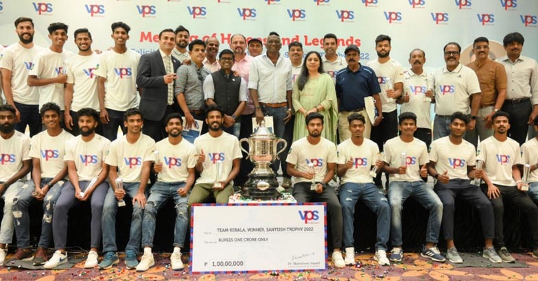 കൊച്ചി: സന്തോഷ് ട്രോഫിയില് മലയാളത്തിന്റെ അഭിമാനമുയര്ത്തിയ മൂന്നു തലമുറയില്പ്പെട്ട താരങ്ങളുടെ അപൂര്വ സംഗമം. വിപിഎസ് ഹെല്ത്ത്കെയര് ചെയര്മാനും മാനേജിങ് ഡയറക്ടറുമായ ഡോ. ഷംഷീര് വയലില് കേരളാ ടീമിനെ അനുമോദിക്കാന് സംഘടിപ്പിച്ച ചടങ്ങാണ് അപൂര്വ സംഗമത്തിന് വേദിയായത്. ചടങ്ങില് കേരളാ ടീമിന് ഒരു കോടി രൂപയുടെ ചെക്കും കൈമാറി.