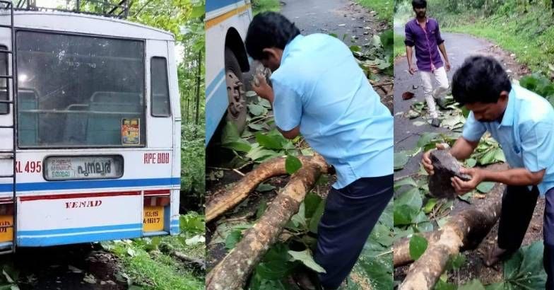 കുംഭാവുരുട്ടിക്കും മണലാറിനും മധ്യേ ആയതിനാല് മൊബൈല് ഫോണിന് ഇവിടെ കവറേജില്ലായിരുന്നു. മരം വീണ വിവരം പുറംലോകത്തെ അറിയിക്കാന് മാര്ഗമില്ലാതെ വന്നതോടെയാണു കണ്ടക്ടര് എംപി വിഭുവ് കരിങ്കല്ല് പ്രയോഗത്തിലേക്ക് എത്തിയത്.