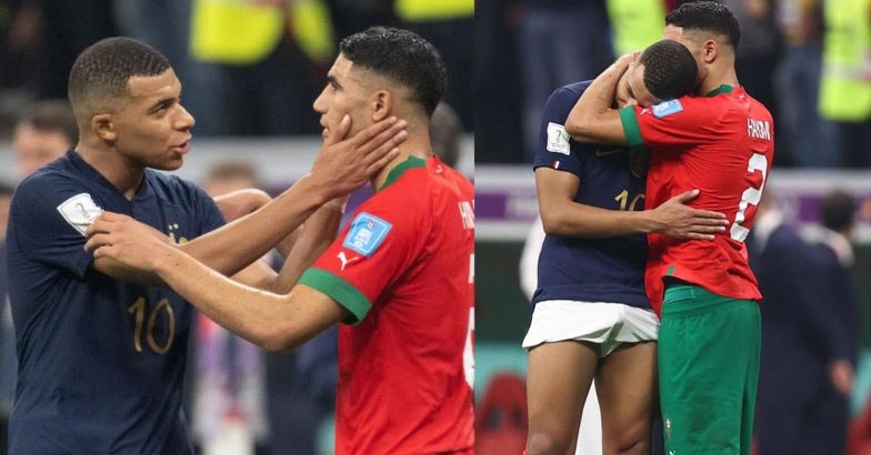 പരാജയപ്പെട്ടതിന്റെ നിരാശയില് ഗ്രൗണ്ടിലിരുന്ന് വിതുമ്പുന്ന ഉറ്റ സുഹൃത്ത് ഹക്കിമിയെ ചേര്ത്തുപിടിച്ച് ആശ്വസിപ്പിക്കുന്ന എംബാപ്പെയുടെ ദൃശ്യങ്ങളാണ് ലോകം ഏറ്റെടുത്തത്. മത്സരത്തിന് ശേഷം ഇരുവരും ജേഴ്സി കൈമാറിയതും ആലിംഗനം ചെയ്തതും സൗഹൃദത്തിന്റെ നല്ല കാഴ്ചയായി.