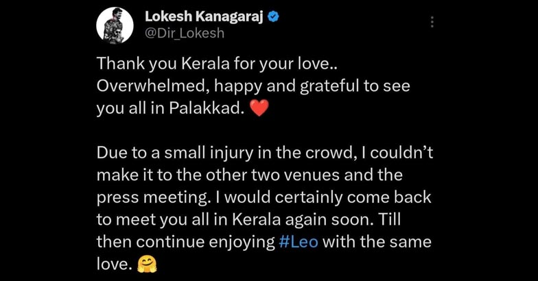 ‘നിങ്ങളുടെ സ്നേഹത്തിന് നന്ദി കേരളം, നിങ്ങളെ എല്ലാവരെയും പാലക്കാട് കണ്ടതില് അതിയായ സന്തോഷവും നന്ദിയും ഉണ്ട്. ആള്ക്കൂട്ടത്തിനിടയില് ഒരു ചെറിയ പരിക്ക് കാരണം എനിക്ക് മറ്റ് രണ്ട് വേദികളിലും പത്രസമ്മേളനത്തിലും എത്താന് കഴിഞ്ഞില്ല. കേരളത്തില് നിങ്ങളെ എല്ലാവരെയും കാണാന് ഞാന് തീര്ച്ചയായും മടങ്ങിവരും. അതുവരെ അതേ സ്നേഹത്തോടെ ലിയോ ആസ്വദിക്കുന്നത് തുടരുക’. ലോകേഷ് ട്വീറ്റ് ചെയ്തു.