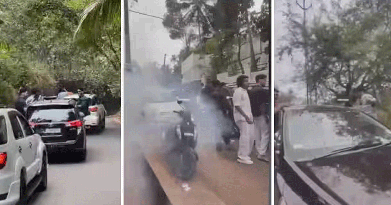 പിന്നില് നിന്നും വന്ന ഒരു വാഹനത്തെയും ഇതിനിടയില് കടന്നുപോകാനും അനുവദിച്ചില്ല. നവവരനും ഈ പരിപാടികളില് സജീവമായി രംഗത്തുണ്ടായിരുന്നു.